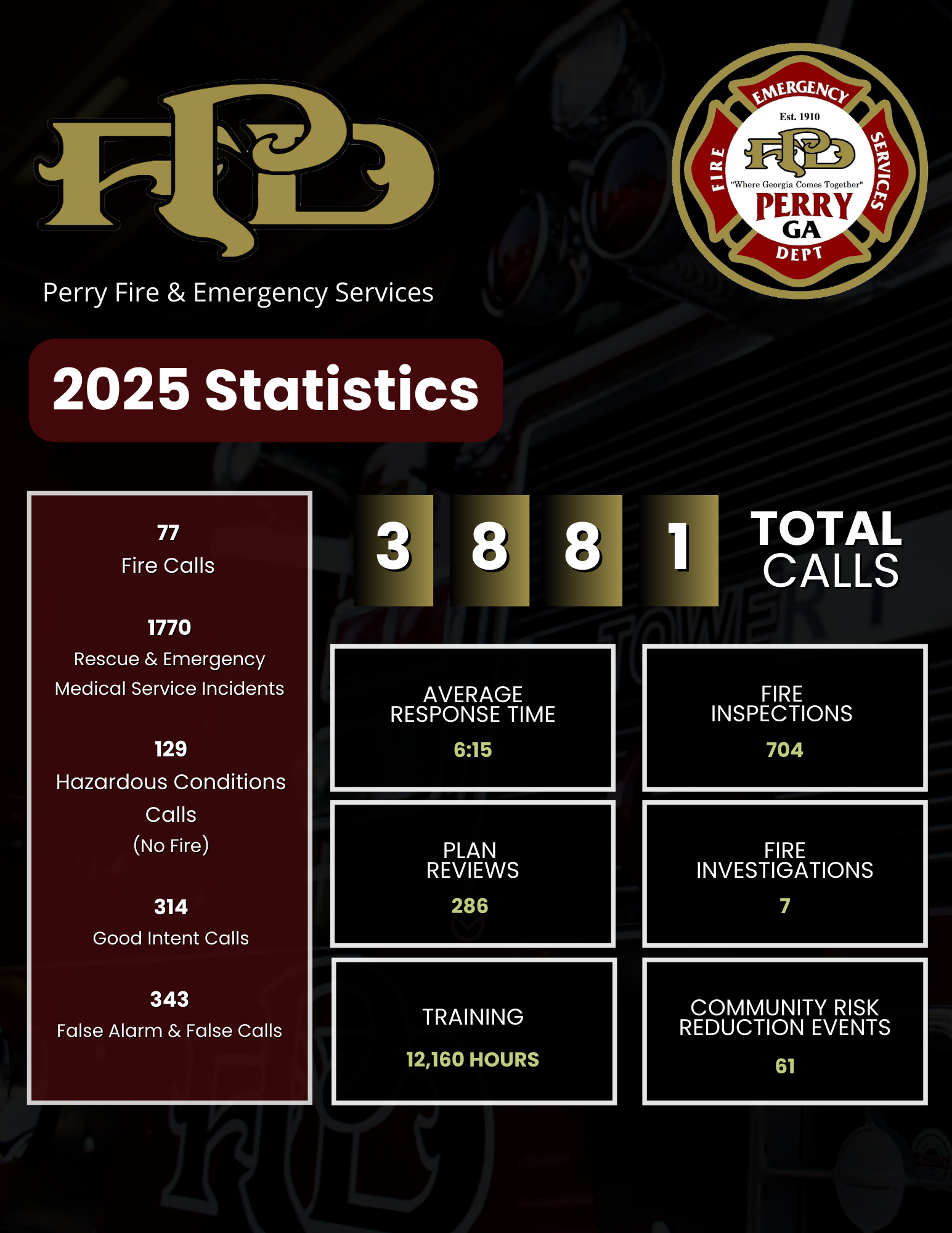 The Perry Fire Department is a 2 station department that contains a staff of firefighters providing fire protection, emergency medical services, technical rescue operations, fire safety education, fire cause investigation, and fire code inspections to a population of over 26,000 over 27.9 square miles.