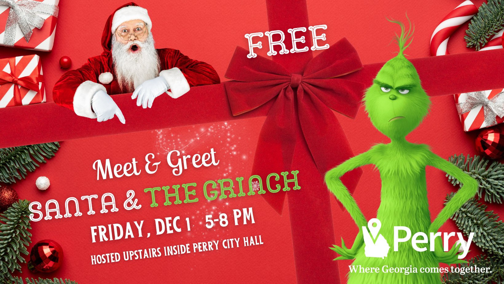 But fear not! Santa, Mrs. Claus, The Grinch, and Cindy Lou Who will are moving to Perry City Hall (808 Carroll Street) to greet you!