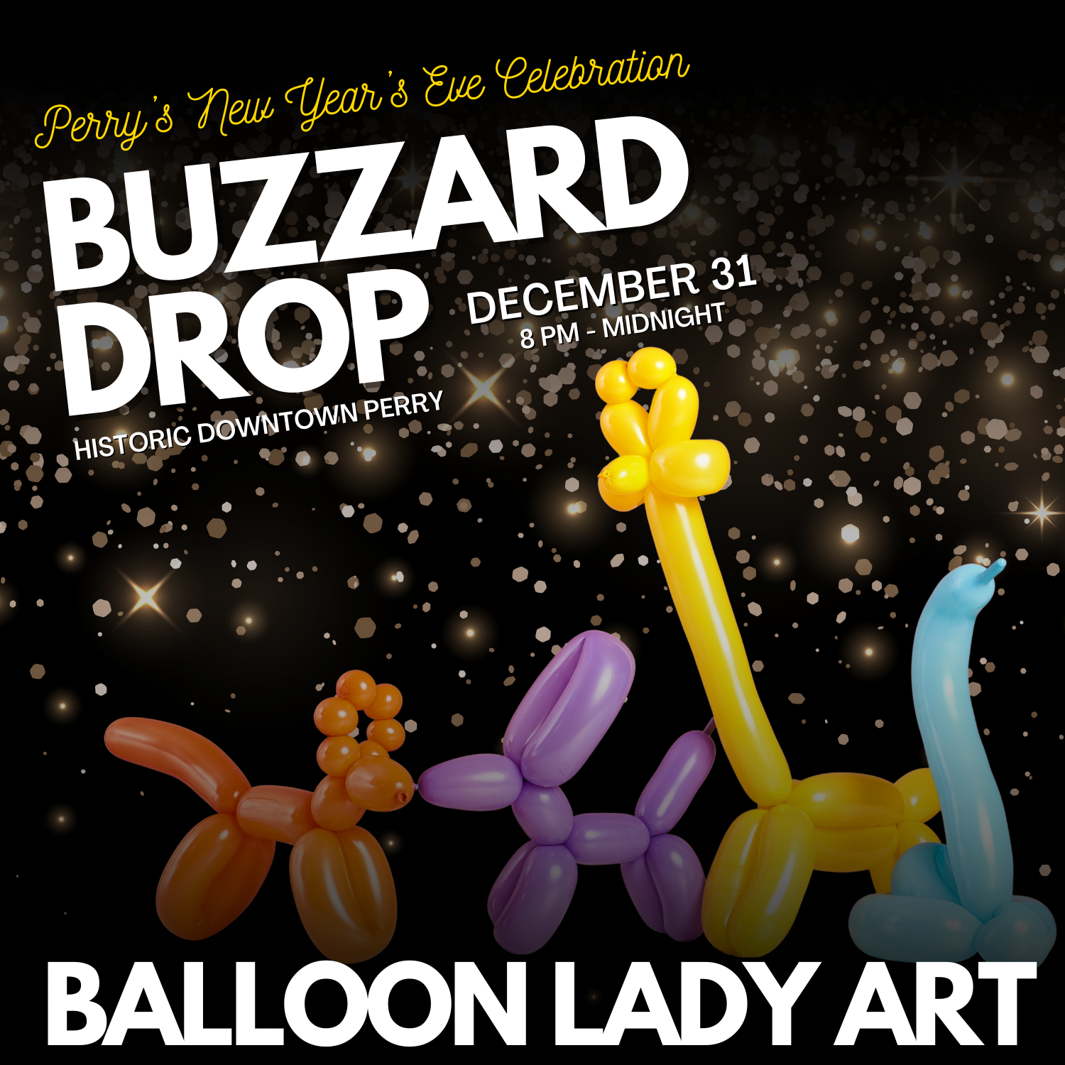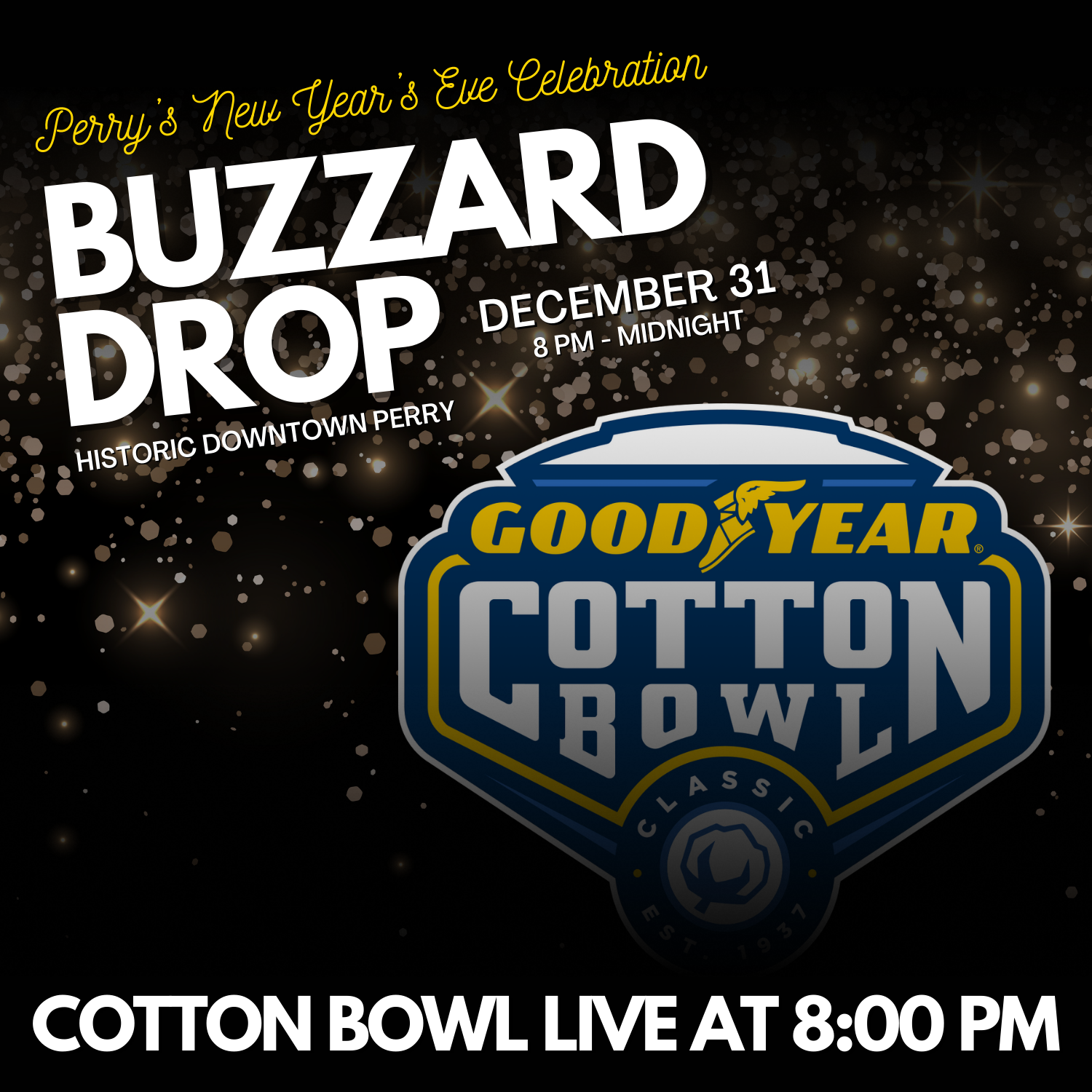 Ring in the New Year with Perry’s unique tradition—The Buzzard Drop! Join us in downtown Perry for an unforgettable celebration as we countdown to midnight in true Perry style. Enjoy live music, tasty food, family-friendly activities, a special kiddie countdown, and the grand finale—the buzzard drop and fireworks to ring in the new year!