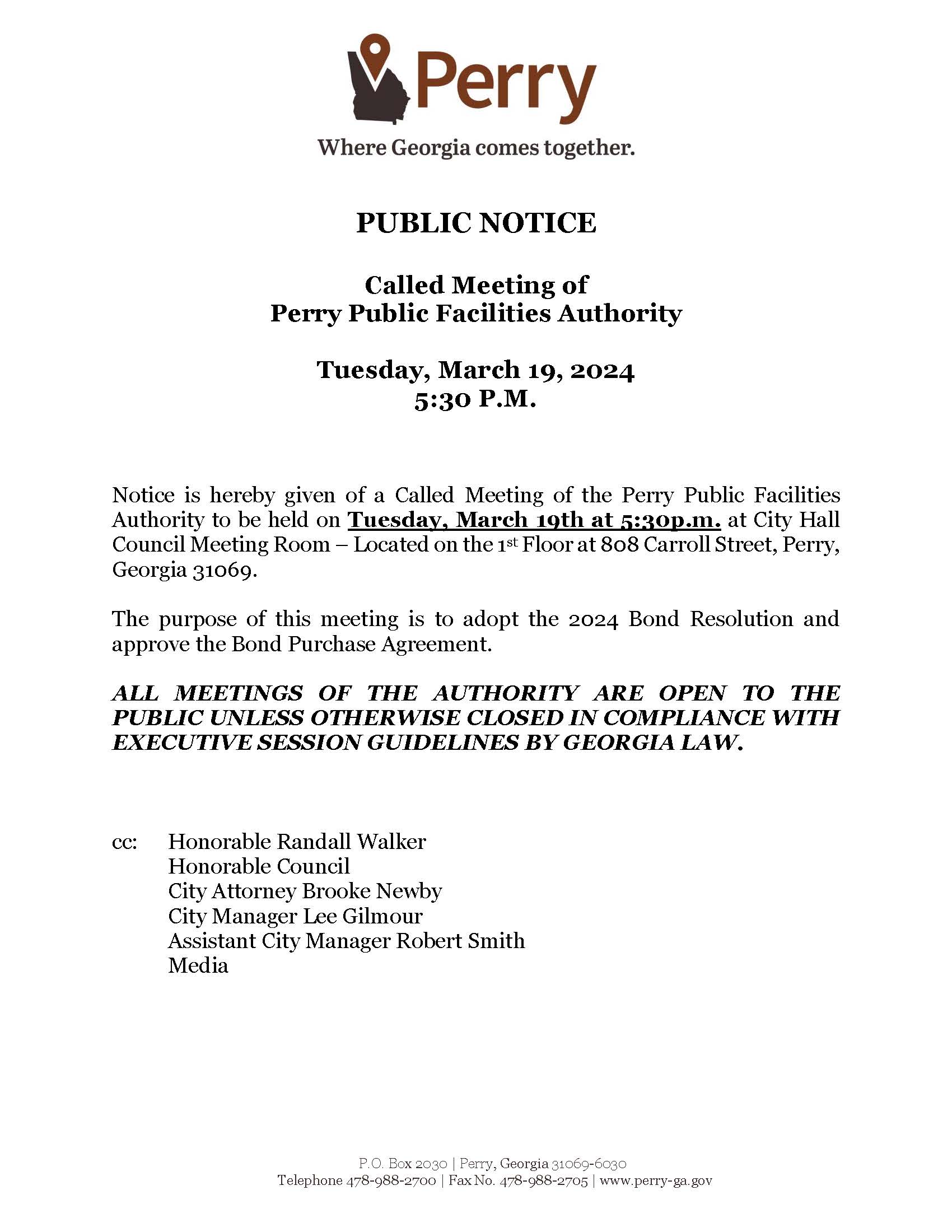 A Special Called Meeting of the Perry Public Facilities Authority will take place on Tuesday, March 19, at 5:30 p.m. at Perry City Hall (808 Carroll Street) in the Council Meeting Room on the 1st floor.