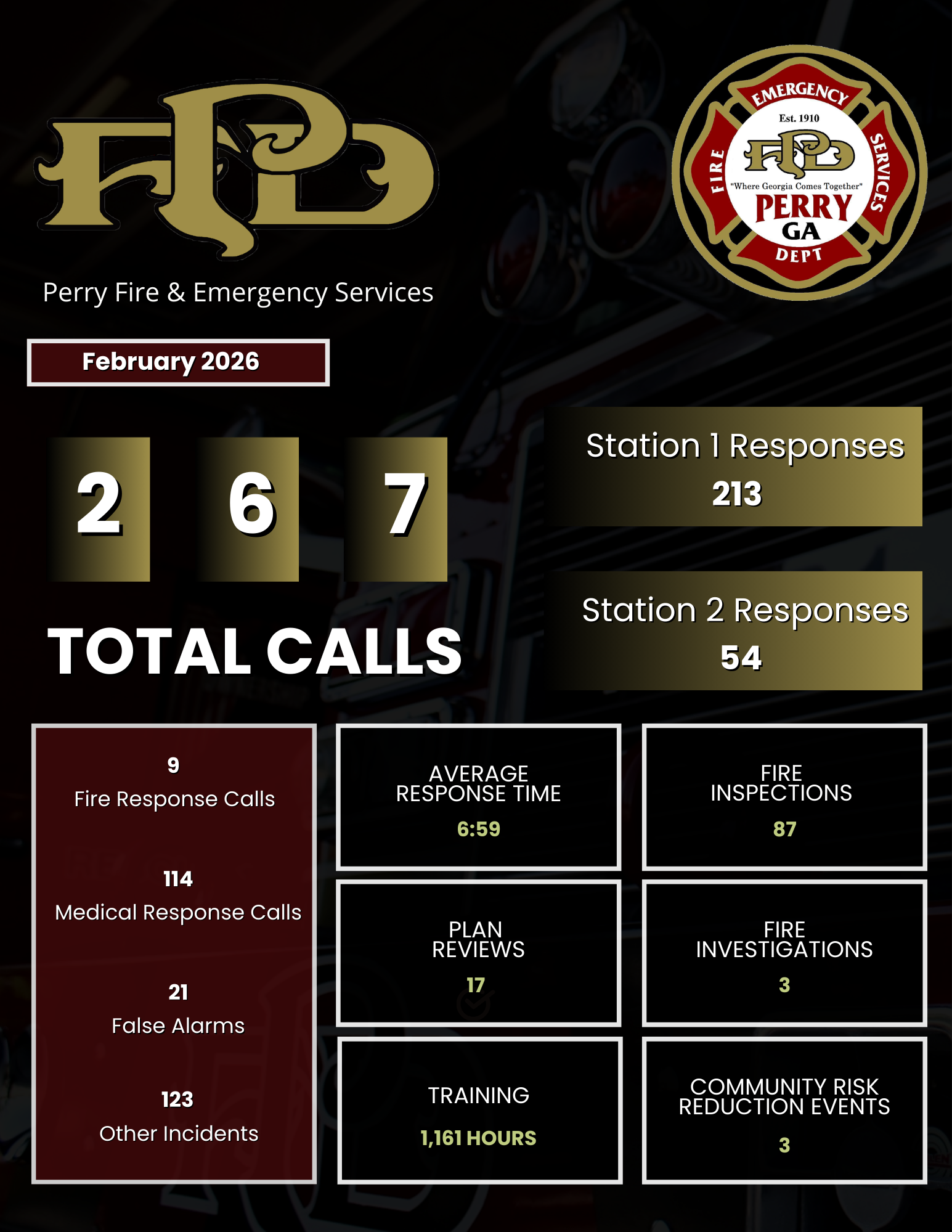 The Perry Fire Department is a 2 station department that contains a staff of firefighters providing fire protection, emergency medical services, technical rescue operations, fire safety education, fire cause investigation, and fire code inspections to a population of over 26,000 over 27.9 square miles.