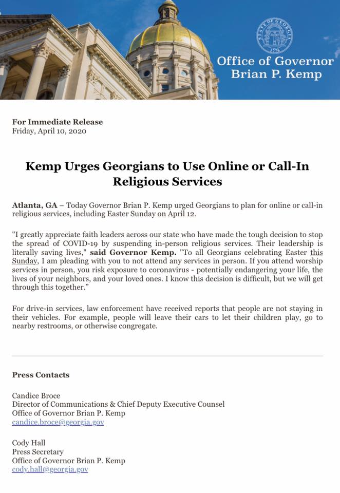 Back to News Gov. Kemp Offers Easter Sunday Guidance Posted on Apr 10, 2020 Keywords News Share ThisShare on FacebookShare on TwitterShare on LinkedInShare by Email